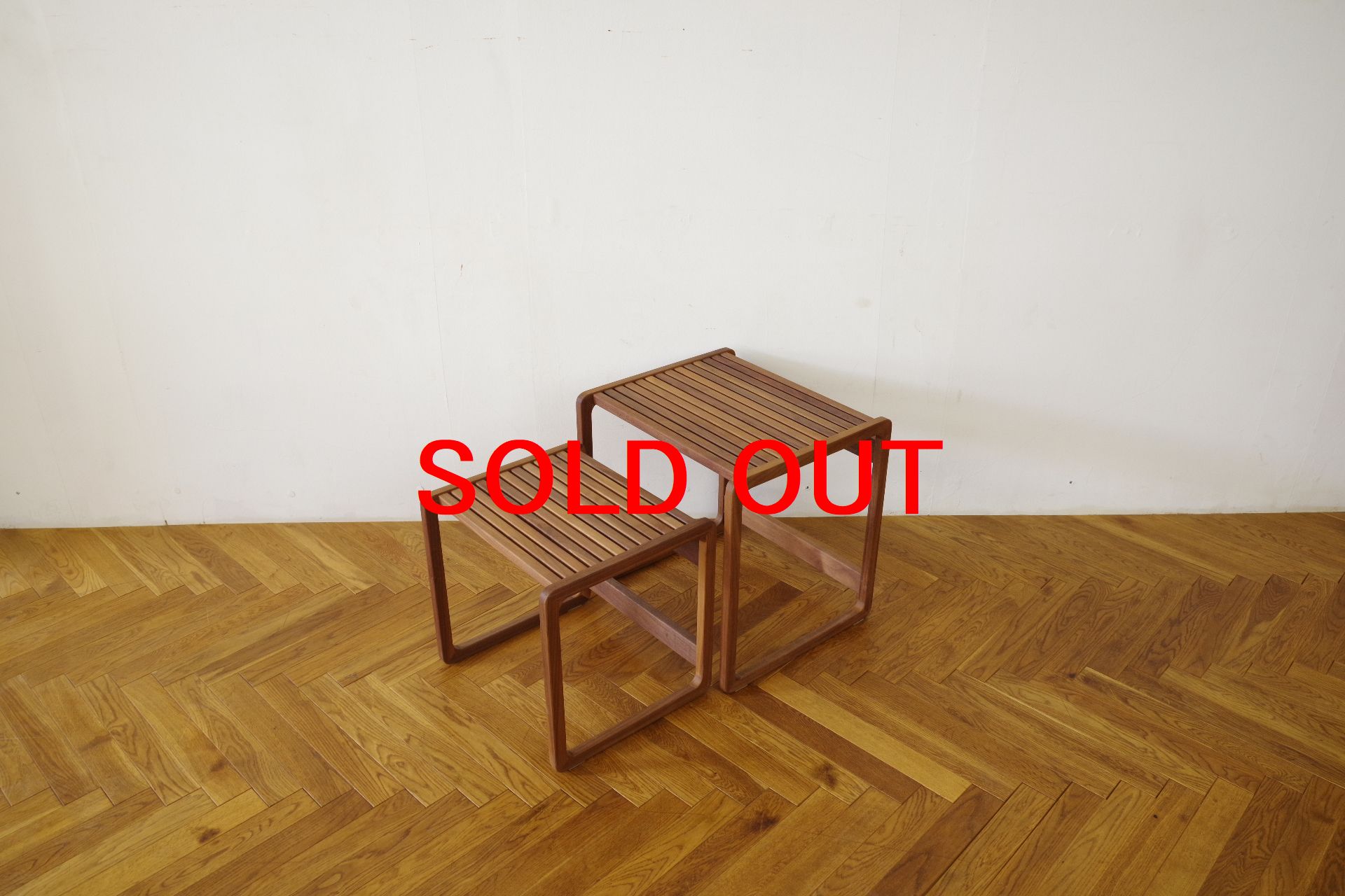 20mm幅の細い無垢材を組み上げて作られたサイドテーブル、日本の建具のようにそれ自体が意匠として静かな存在感を出しています。サイドテーブルとして使用したり、飾る棚として使用しても良いかもしれません。1つ1つが軽く持ち運びも楽にできます。別々に使用したり、使わないときは重ねて収納できます。材質はウォルナット材で、展示品ですがきれいな状態です。お届け前にはもう一度オイルを塗ってメンテナンス致します。