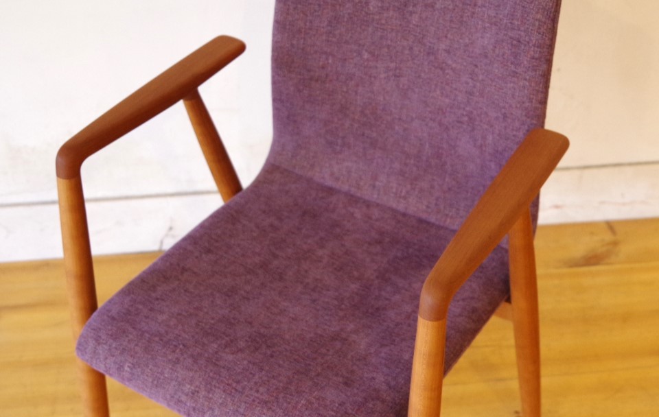 座面から背もたれまで一体となっている成型合板が使われています。成型合板は体のラインに合わせ板を曲げて形を作ることができます。座ると体を包み込むホールド感があります。弾力もあり、しなり具合も心地よいです。背もたれに高さがありややハイバックな椅子です。しっかりしたアームで安定感があります。宮崎椅子製作所の技術でどこを触っても手触りが良いです。ファブリックの印象でイメージも色々変えられます。