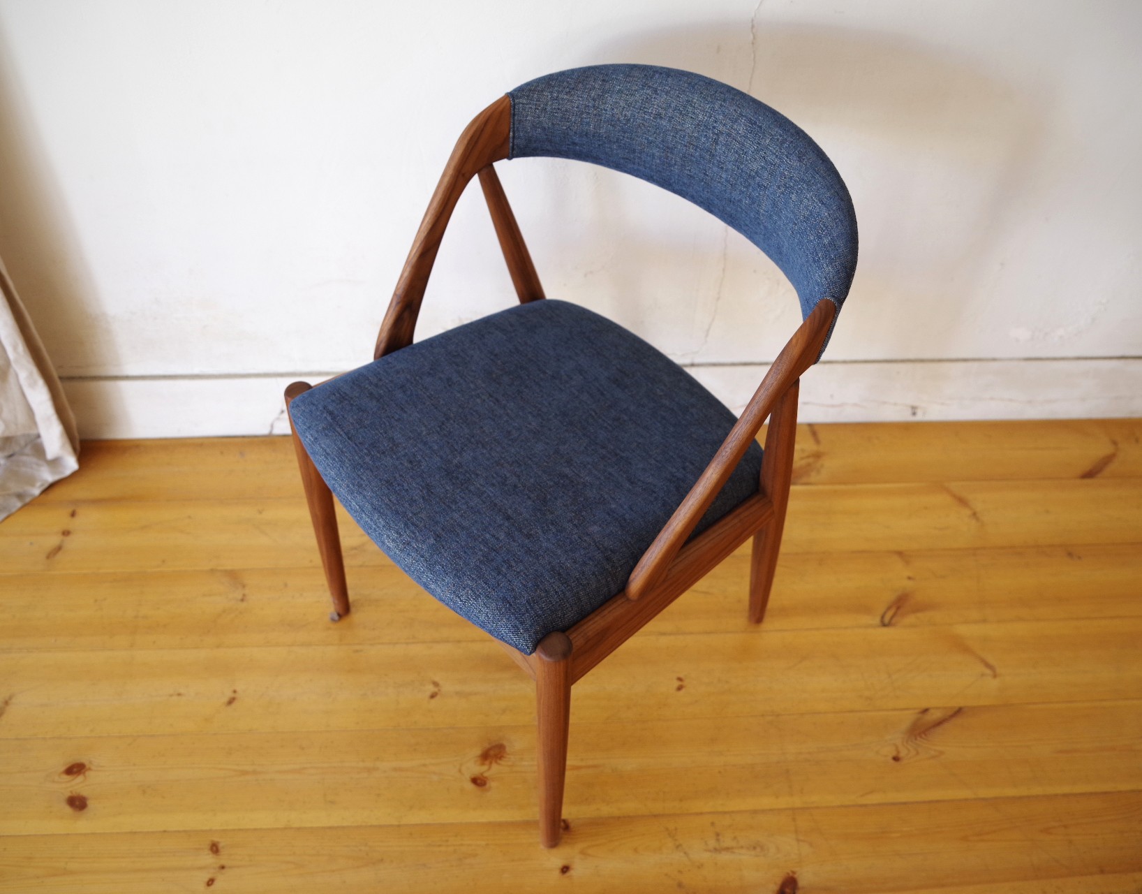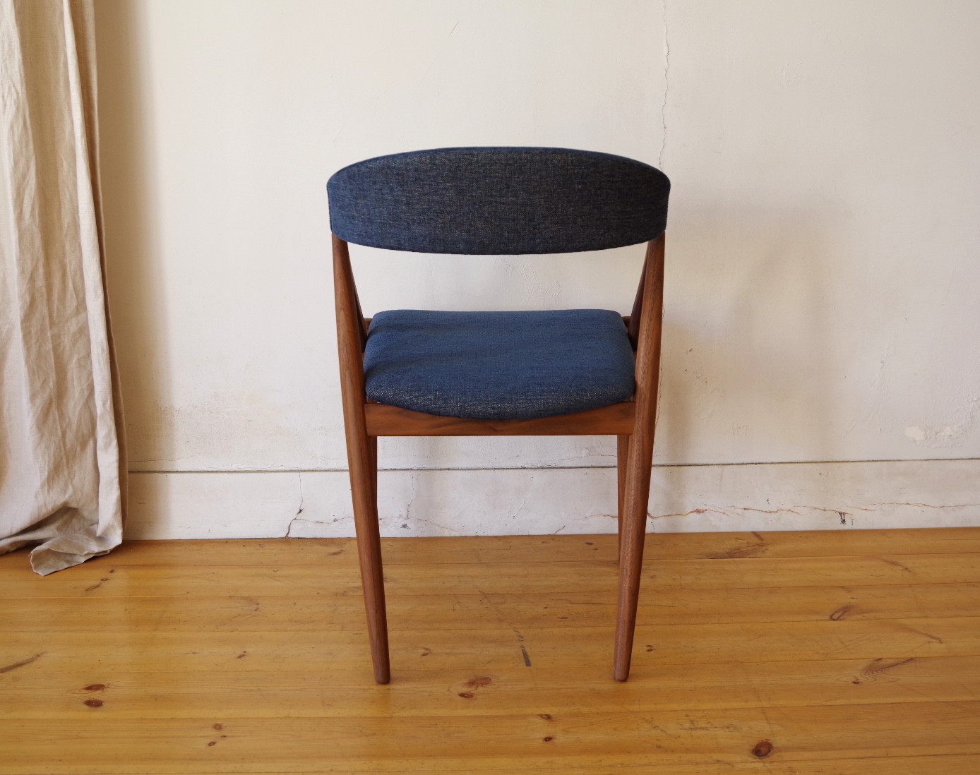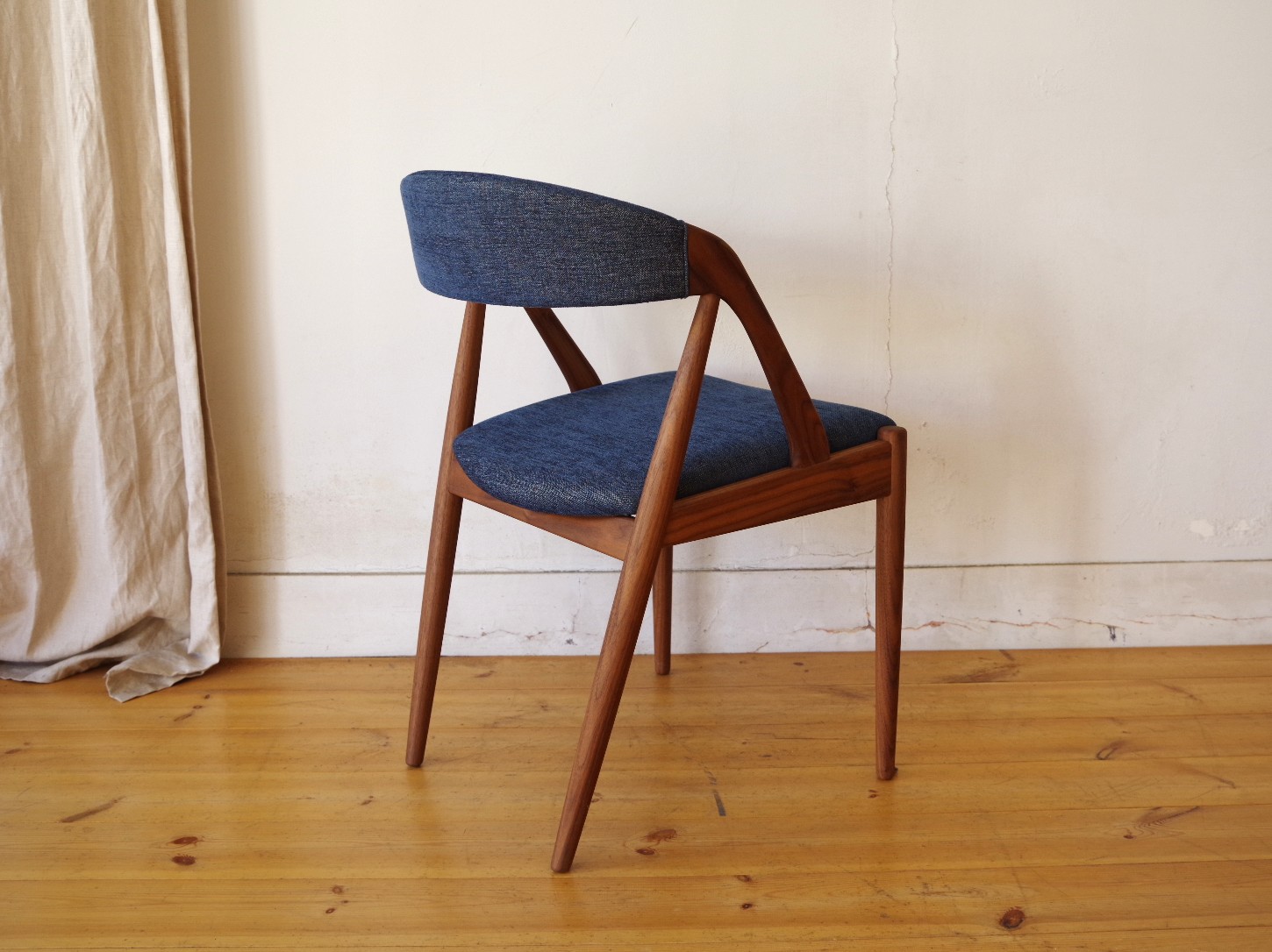 デンマークのデザイナー カイ・クリスチャンセンが1956年にデザインしたNV-31チェアをベースに、2014年に日本の宮崎椅子製作所よりHANDYチェアとして正規に復刻されたモデルです。弧を描いた背もたれが背中をやさしく包んでくれて心地良いです。その背もたれがそまま座枠まで下りてきて横から見ると三角形に組まれています。トラス構造と呼ばれ見た目の美しさもありますが、高度な技術が必要とされ強度も保つことができます。座面の高さがオリジナルサイズの45cmのハイタイプと日本人向けの42cmのロータイプが用意されています。