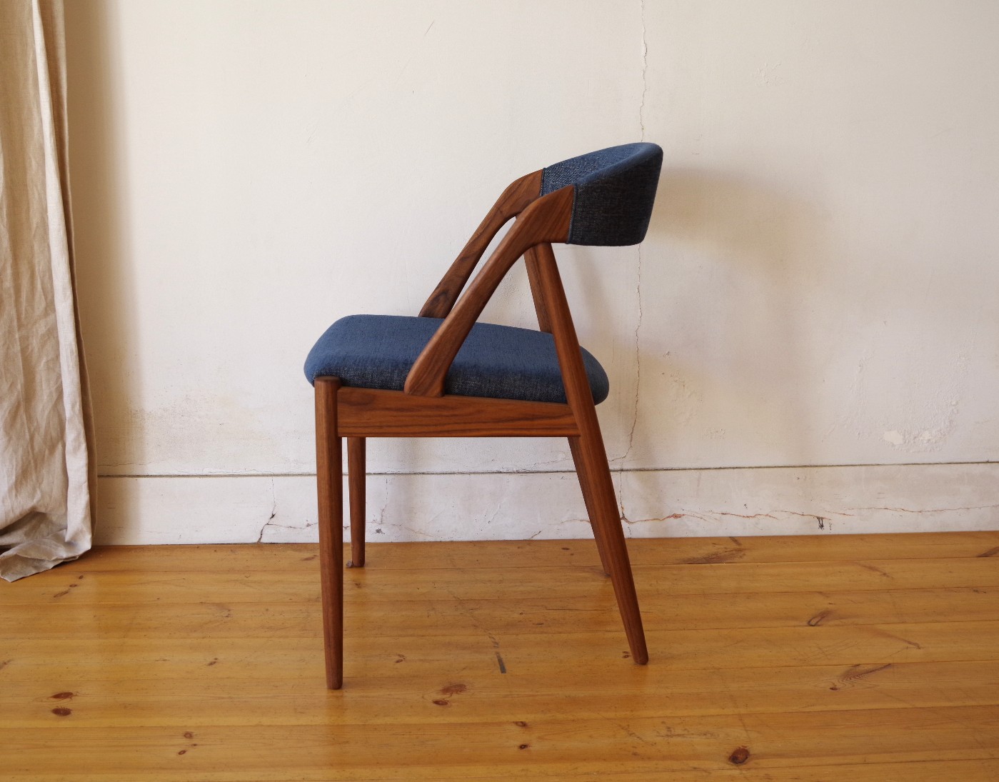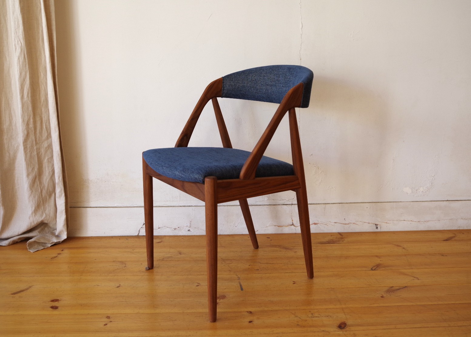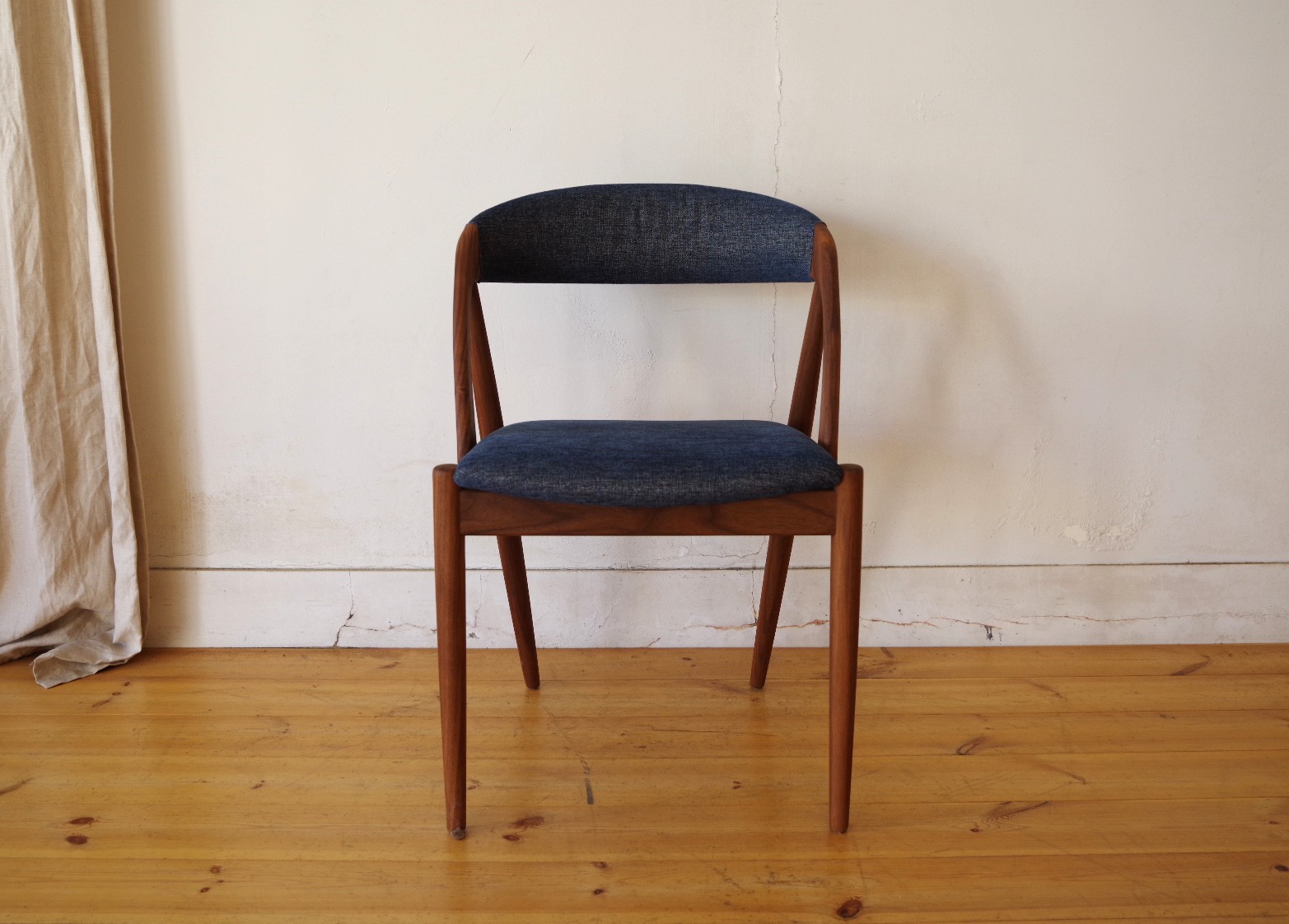 デンマークのデザイナー カイ・クリスチャンセンが1956年にデザインしたNV-31チェアをベースに、2014年に日本の宮崎椅子製作所よりHANDYチェアとして正規に復刻されたモデルです。弧を描いた背もたれが背中をやさしく包んでくれて心地良いです。その背もたれがそまま座枠まで下りてきて横から見ると三角形に組まれています。トラス構造と呼ばれ見た目の美しさもありますが、高度な技術が必要とされ強度も保つことができます。座面の高さがオリジナルサイズの45cmのハイタイプと日本人向けの42cmのロータイプが用意されています。