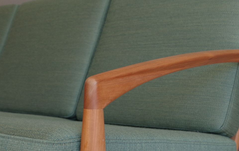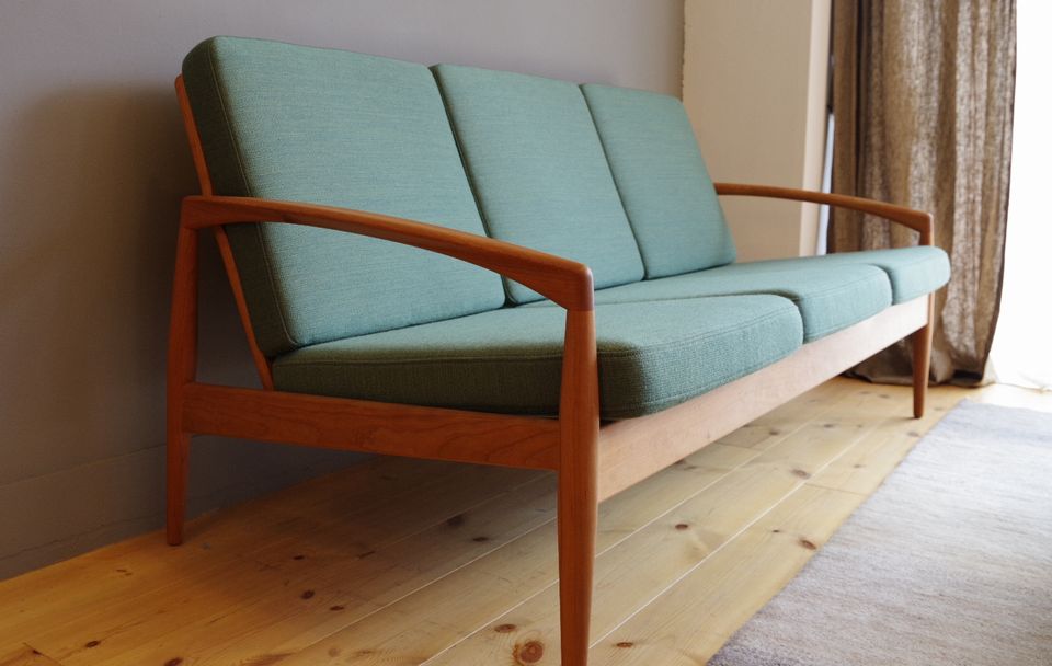 無垢の木を削りだし、まるでペーパーナイフのようにシャープなアーム。そこにゆったりとした座り心地が加わります。デンマークのデザイナー カイ・クリスチャンセン氏が1959年にデザインしたソファで、製作にあたり高度な技術が必要な為、長らく廃盤になっておりました。2008年に日本の宮崎椅子製作所により正規復刻されました。木で組まれたフレームはどこから見ても美しく、丁寧に作られています。幅、奥行、高さがコンパクトサイズですので、部屋に入れたときに圧迫感がありません。座面は適度な硬さで下部にバネが張られていますのでクッション性があります。見た目よりゆったり出来ます。機能性と美しさを兼備えたソファーです。3人掛け、2人掛け、1人掛けとサイズバリエーションがあります。