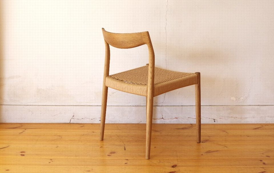 岐阜県の飛騨高山に工房を構える「COYA Fine Furniture」飛騨産の木材を使い手仕事で家具を作り上げています。代表作のSail チェアは背もたれの笠木に、飛騨家具の伝統技術でもある曲木の技術が使われ、緩やかなカーブが心地よい背あたりです。その笠木からなめらかな曲線で後ろ脚へと伸びていくフォルムは、どこから見ても美しい椅子です。人間工学に基づき微妙な角度が調整されており、心地よい座り心地です。サイズ感も日本人の体形に合わせ、やや小ぶりでどなたでも体にフィットします。こちらはアームレスタイプの座面ペーパーコード仕様です。