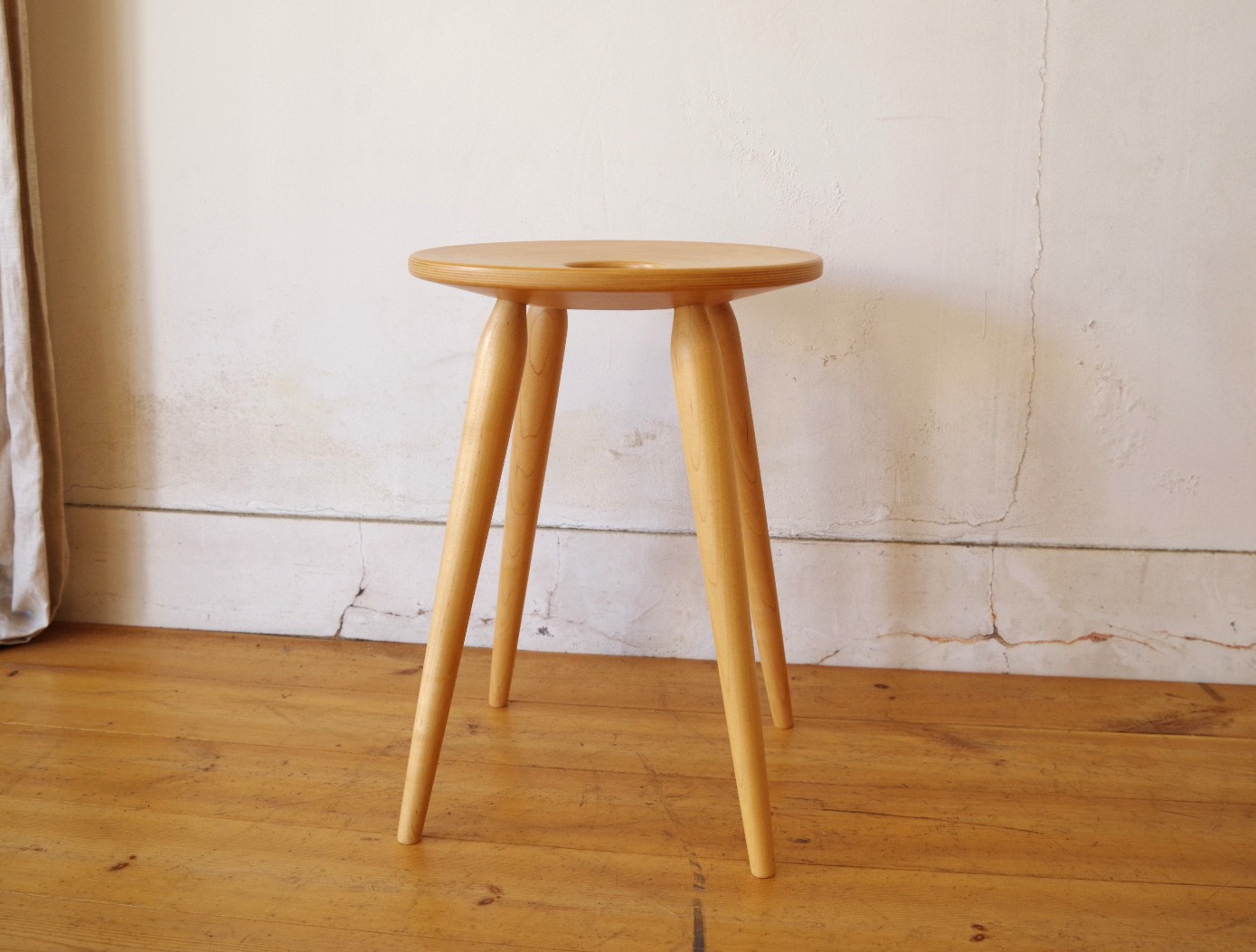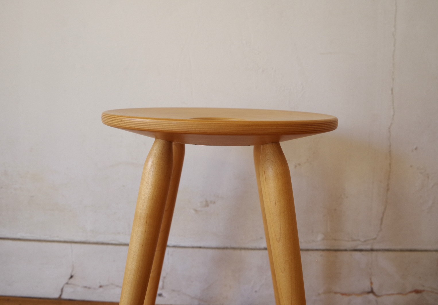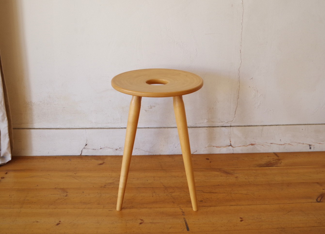 座面が丸く中央に穴が開いていて名前の通りリング状のスツールです。持ち運びもしやすく色々な場所で使えそうです。座面板に4本の脚が組み込まれているだけのシンプルな作りが美しく、その板はビーチ材の積層合板でつくられており、中央の丸穴に向けて傾斜していく作りにより積層された板が連続で模様のように表れています。