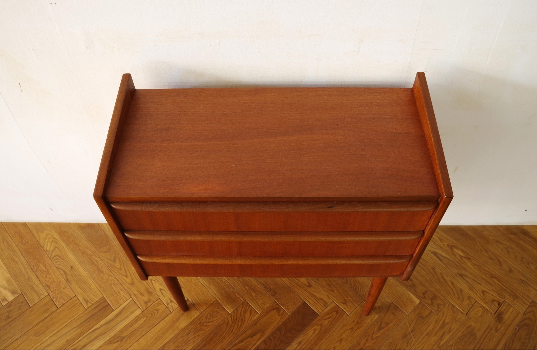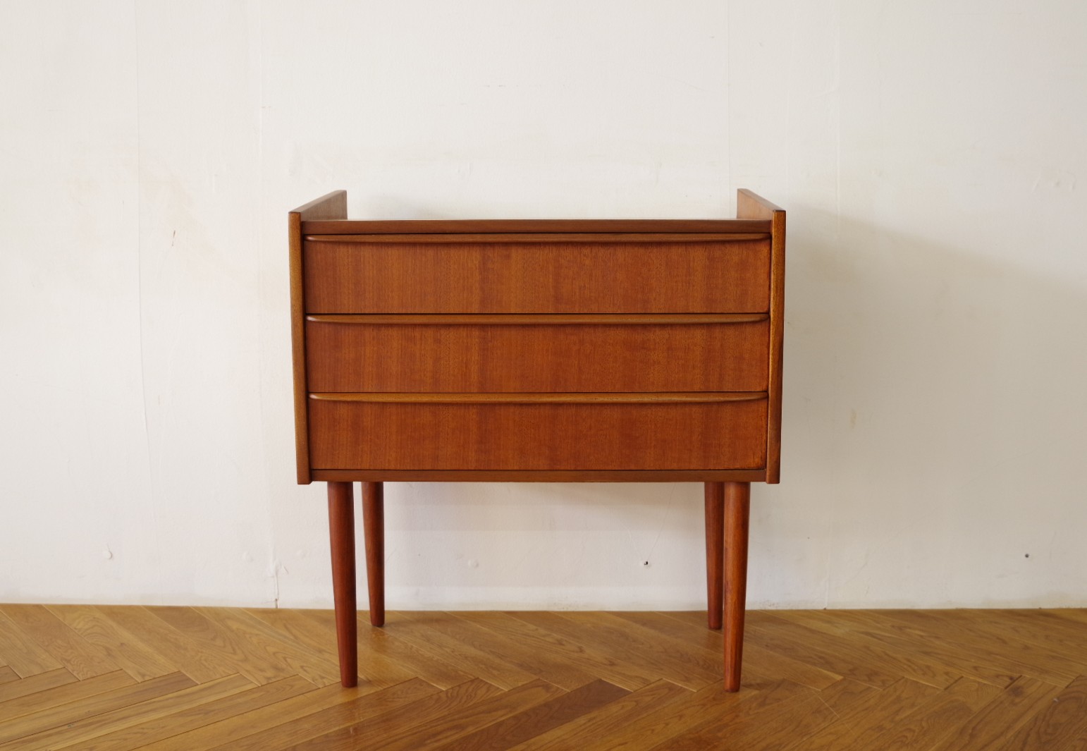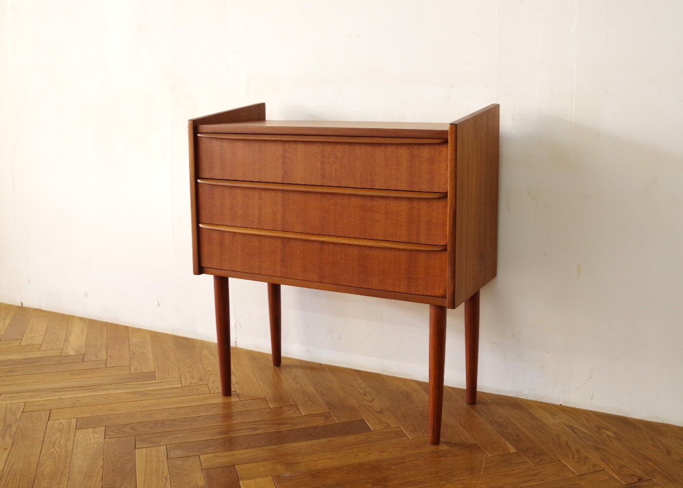 浅めの引き出しが3段あるスモールチェスト。ソファサイドやベッドサイド、玄関など場所を選ばず置けそうです。文具や書類など細々した物の収納に便利です。細く伸びた脚とシャープな取っ手がシンプルながら素敵なチェストです。上部にお気に入りの雑貨などを飾っても楽しめるアイテムだと思います。