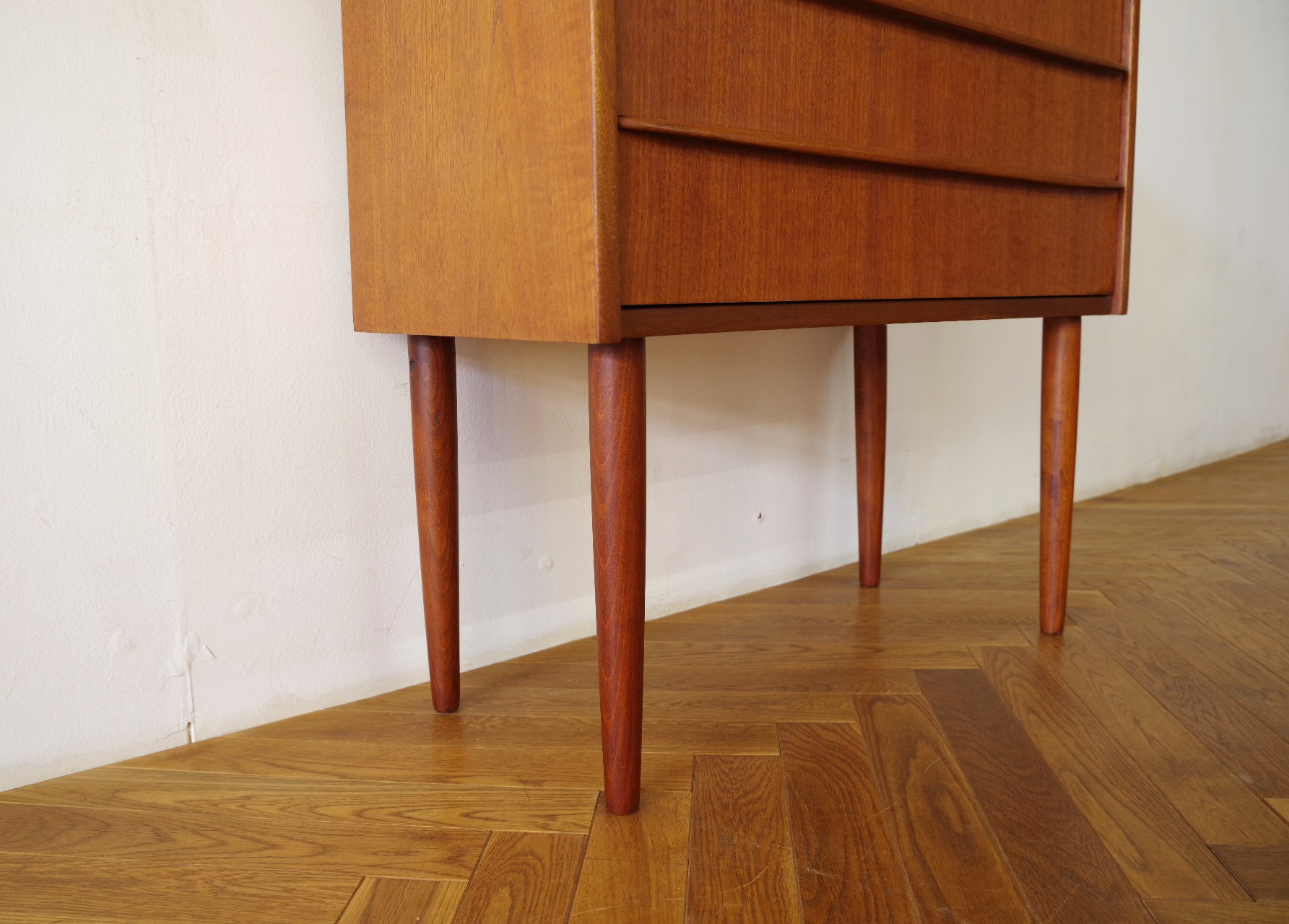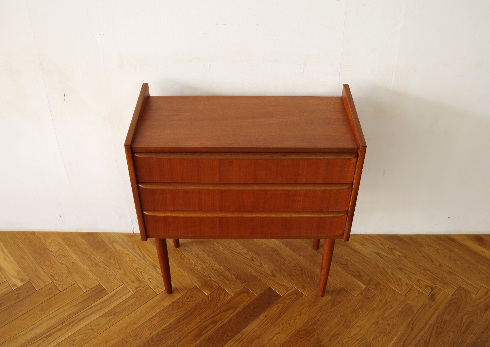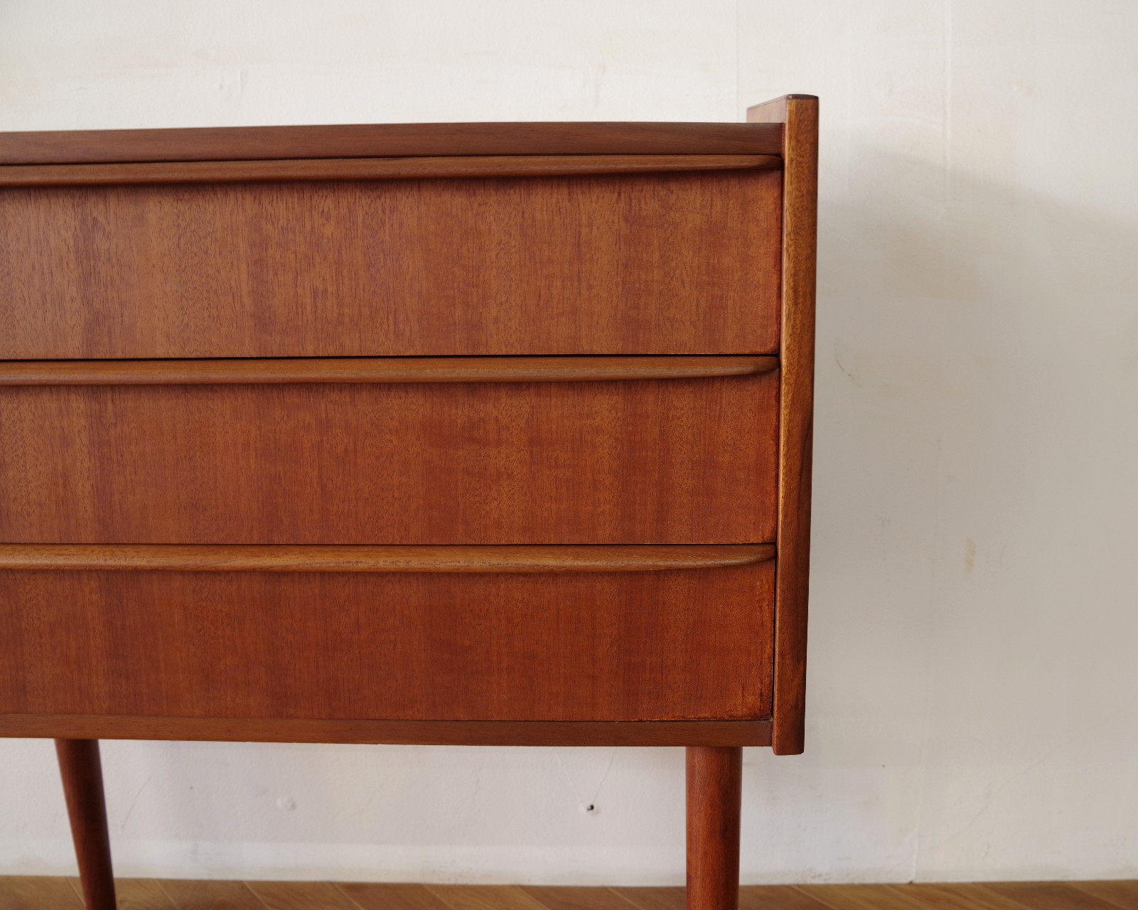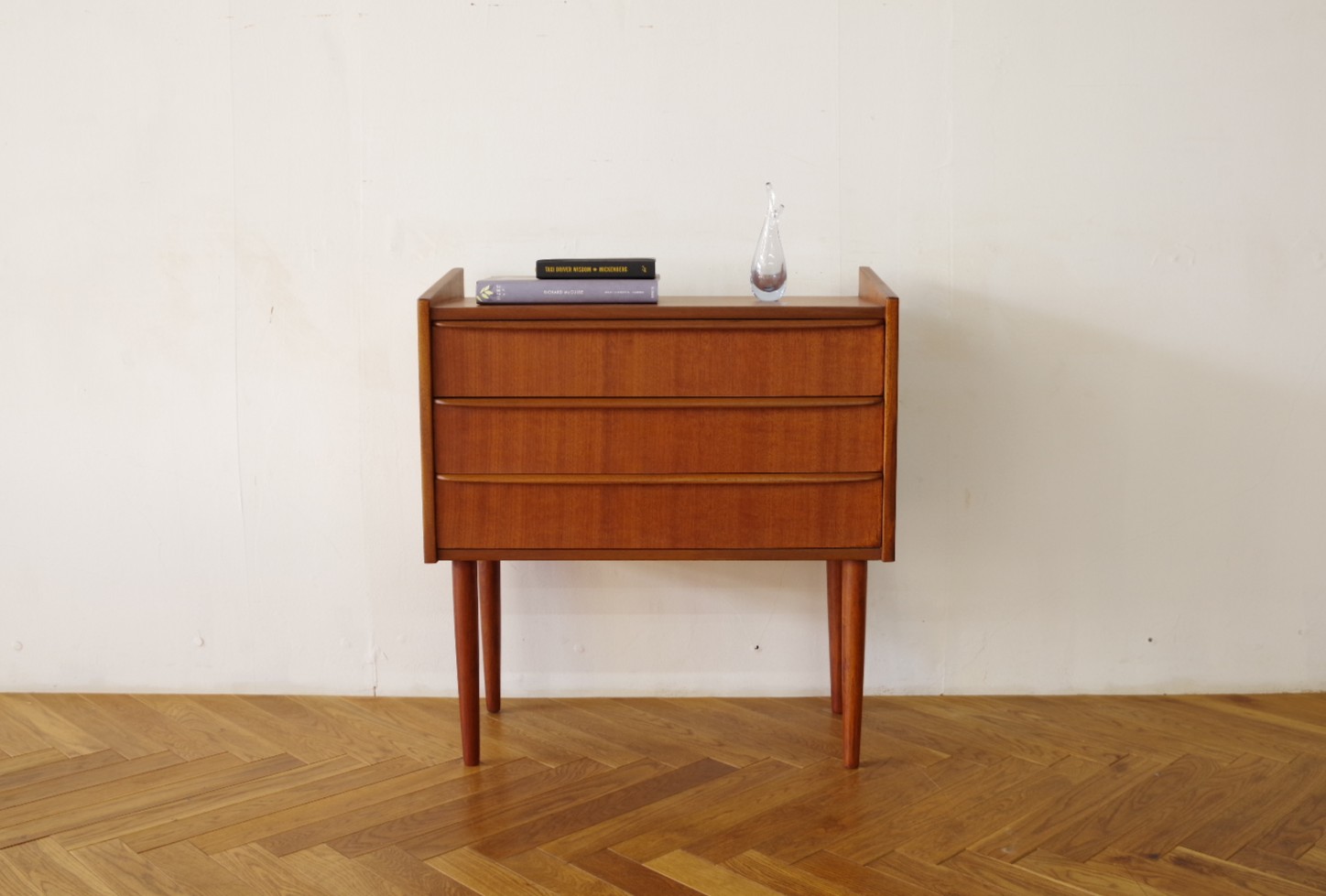 浅めの引き出しが3段あるスモールチェスト。ソファサイドやベッドサイド、玄関など場所を選ばず置けそうです。文具や書類など細々した物の収納に便利です。細く伸びた脚とシャープな取っ手がシンプルながら素敵なチェストです。上部にお気に入りの雑貨などを飾っても楽しめるアイテムだと思います。