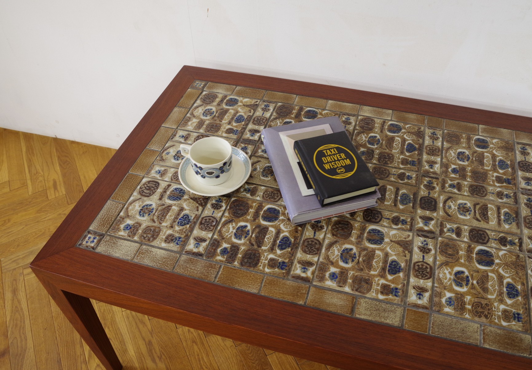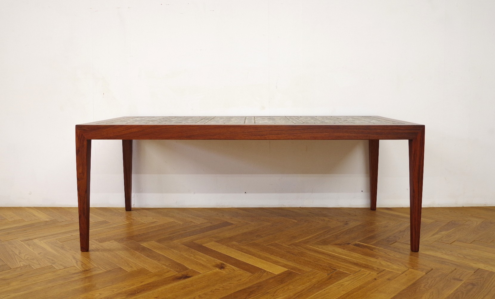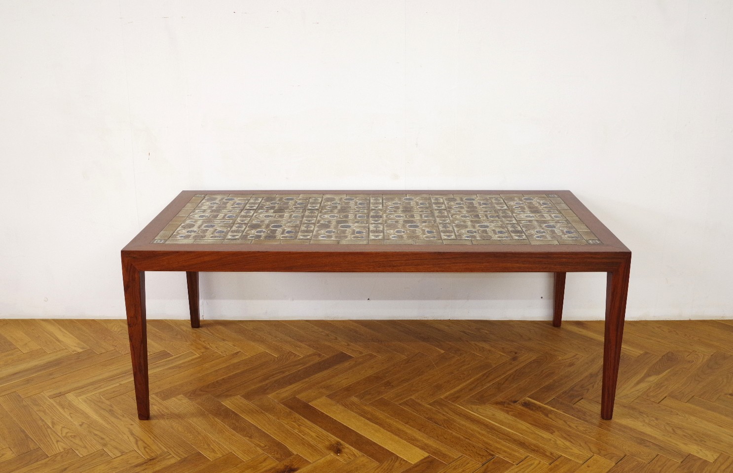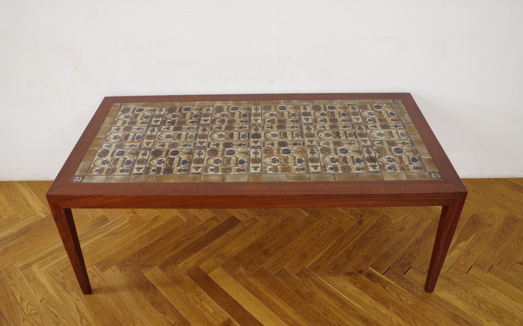 デンマークの家具メーカー、ハスレヴェ社とロイヤルコペンハーゲンとのコラボレーションで生まれたタイルトップテーブル。1960年代に多く製造されていたようです。こちらのコーヒーテーブルはロイヤルコペンハーゲンのデザイナーだったニルス・トーソンが手掛けたBACAシリーズのタイルが張られています。貝をモチーフにしたような絵柄で、落ち着いたブラウンを基調に青の釉薬が上品さを出しています。ローズウッドのフレームともコントラストが素敵です。大きすぎず小さすぎないサイズで、置くだけでまるでアートのような存在感があります。木部補修は元の塗装をはがし全体を段階的に研磨しキズやシミを取り除き、色調を合わせながら水分の浸み込みもなく、また熱に強い塗装で仕上げております。タイルの欠けなどもございません。安心してお使いいただけます。