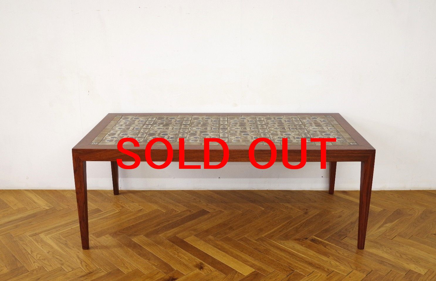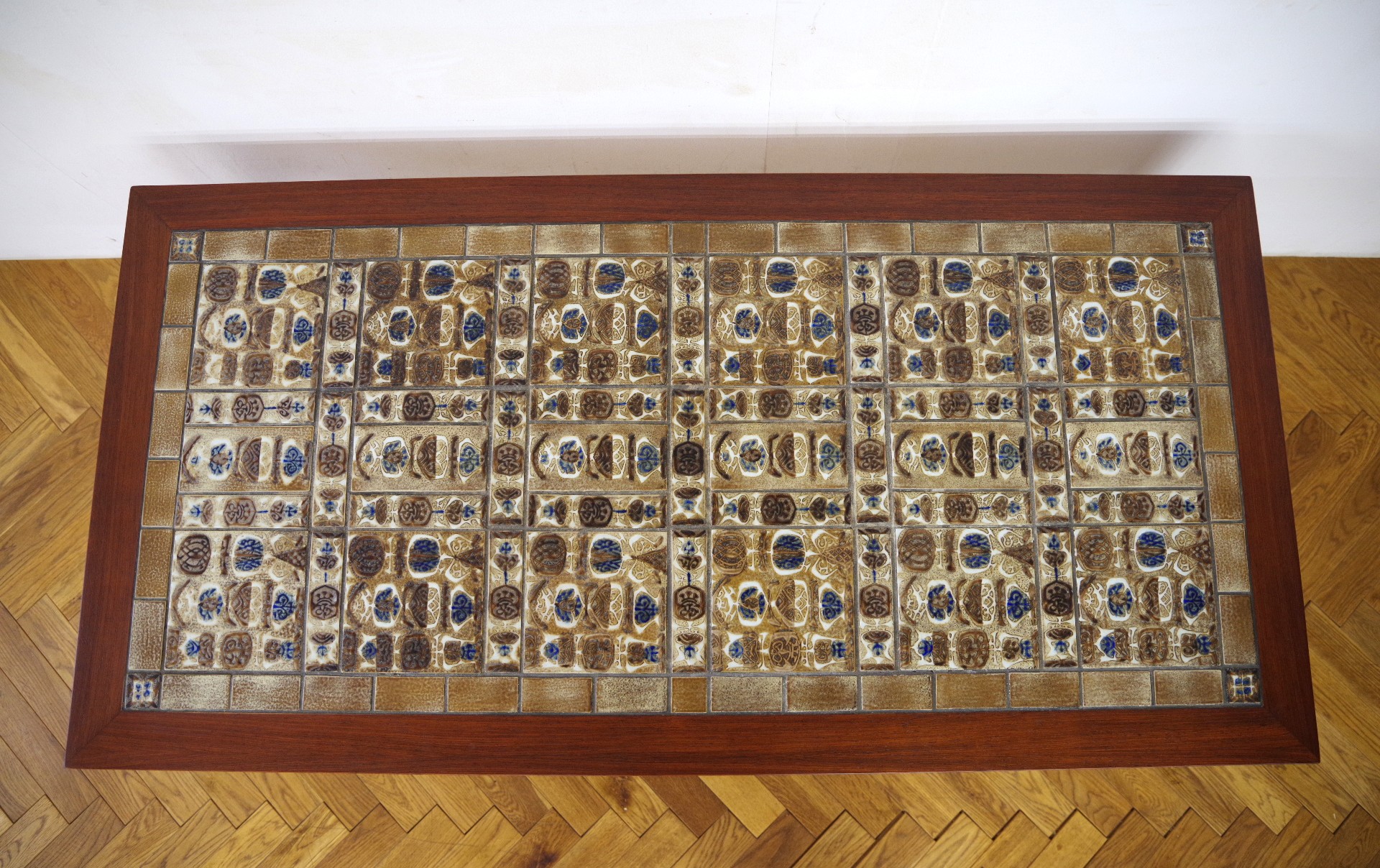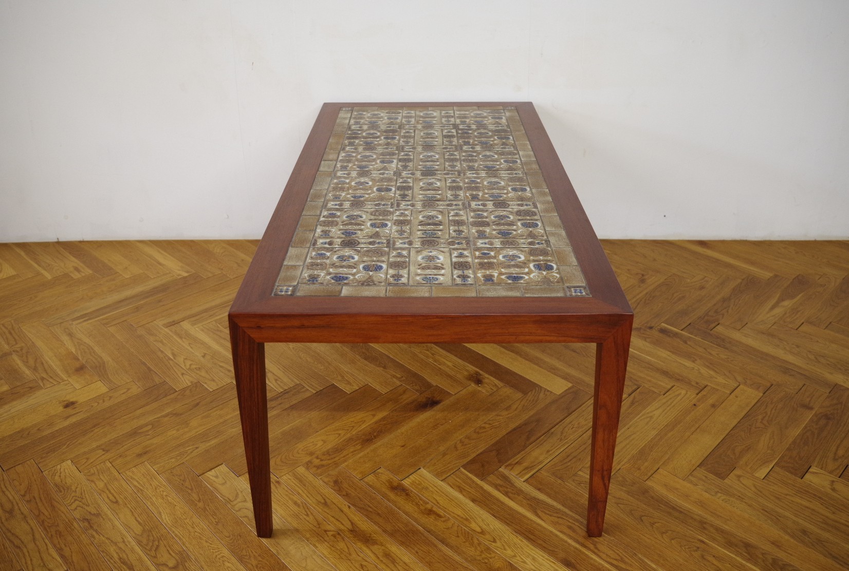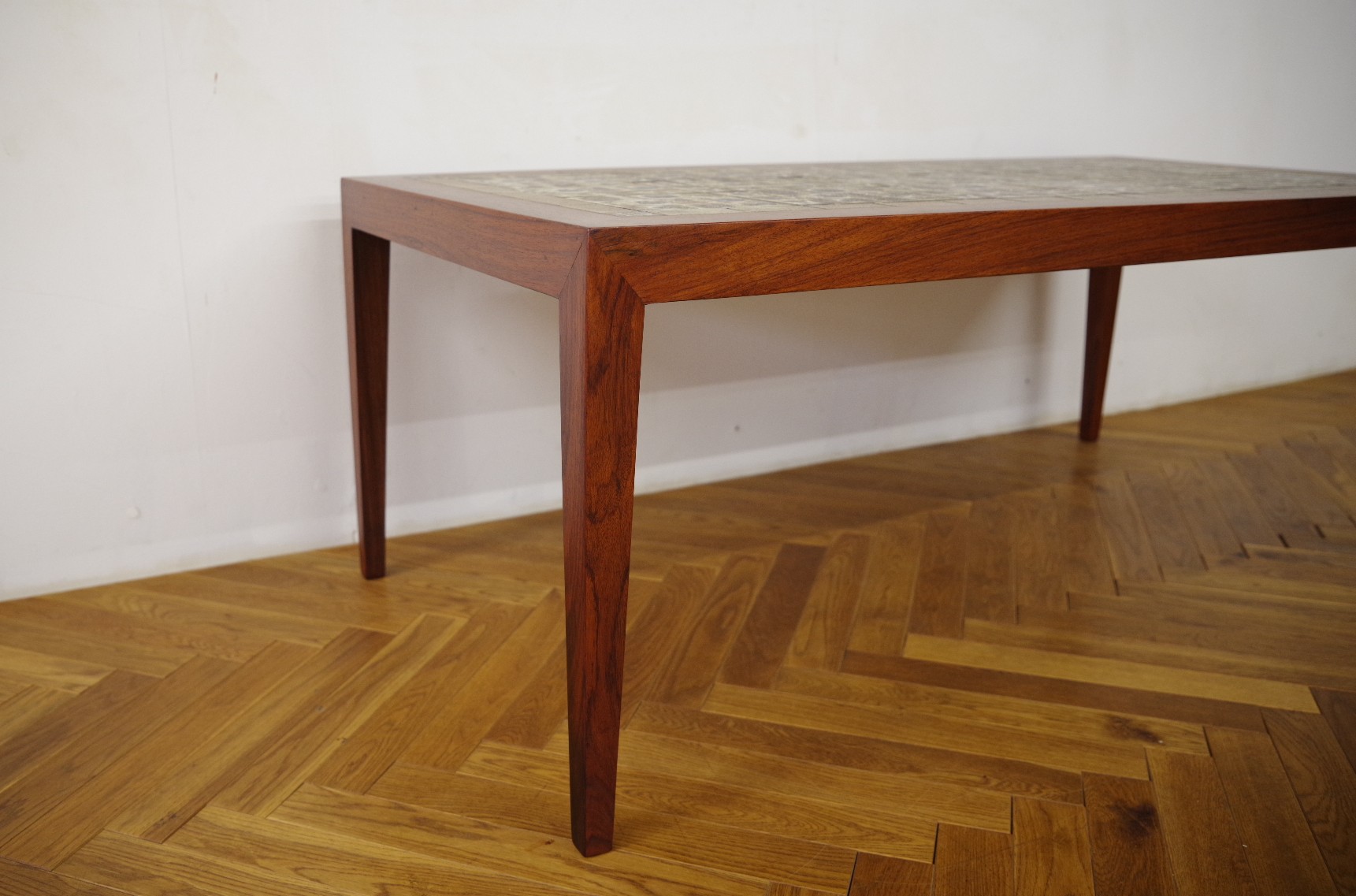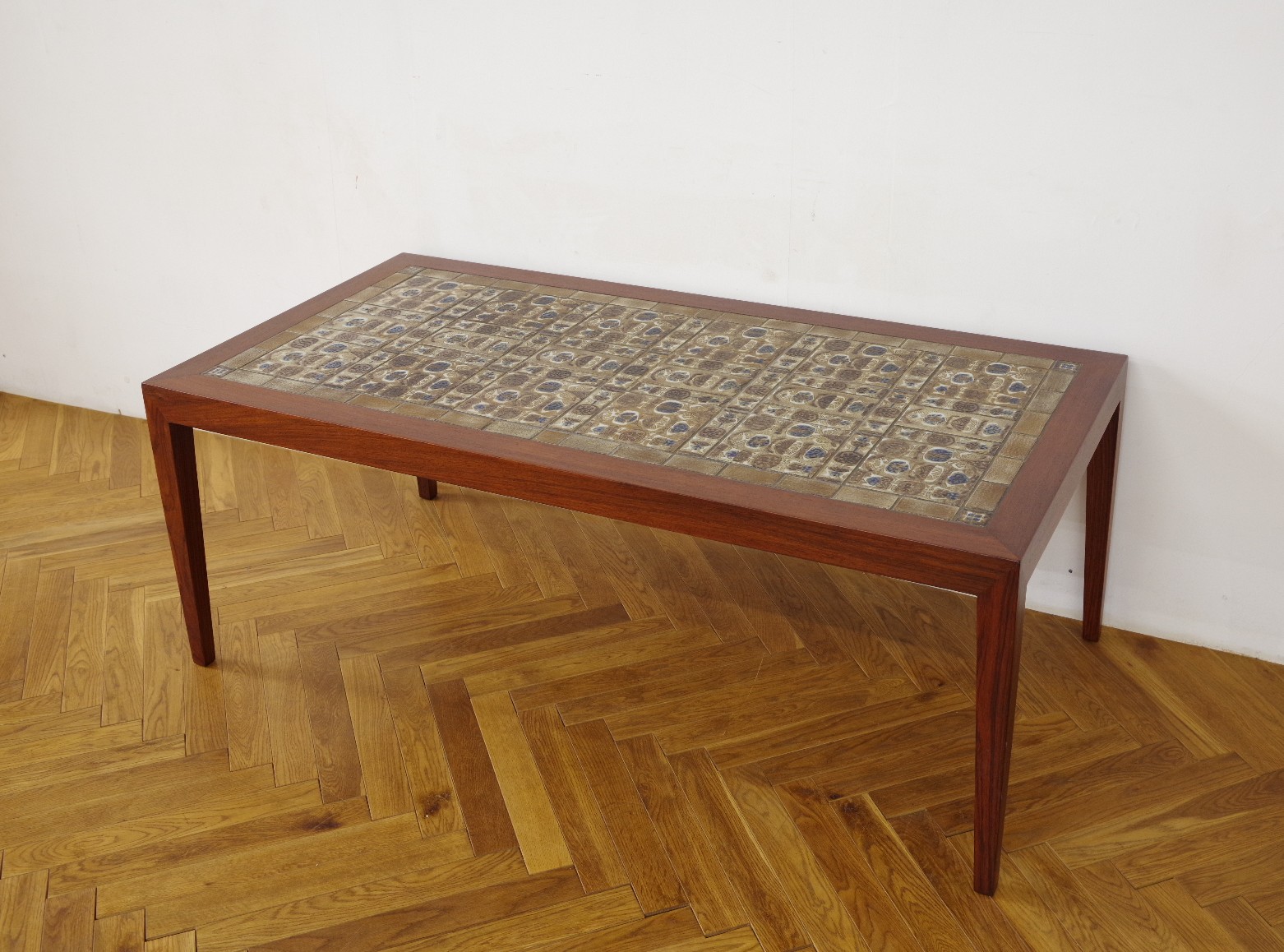 デンマークの家具メーカー、ハスレヴェ社とロイヤルコペンハーゲンとのコラボレーションで生まれたタイルトップテーブル。1960年代に多く製造されていたようです。こちらのコーヒーテーブルはロイヤルコペンハーゲンのデザイナーだったニルス・トーソンが手掛けたBACAシリーズのタイルが張られています。貝をモチーフにしたような絵柄で、落ち着いたブラウンを基調に青の釉薬が上品さを出しています。ローズウッドのフレームともコントラストが素敵です。大きすぎず小さすぎないサイズで、置くだけでまるでアートのような存在感があります。木部補修は元の塗装をはがし全体を段階的に研磨しキズやシミを取り除き、色調を合わせながら水分の浸み込みもなく、また熱に強い塗装で仕上げております。タイルの欠けなどもございません。安心してお使いいただけます。