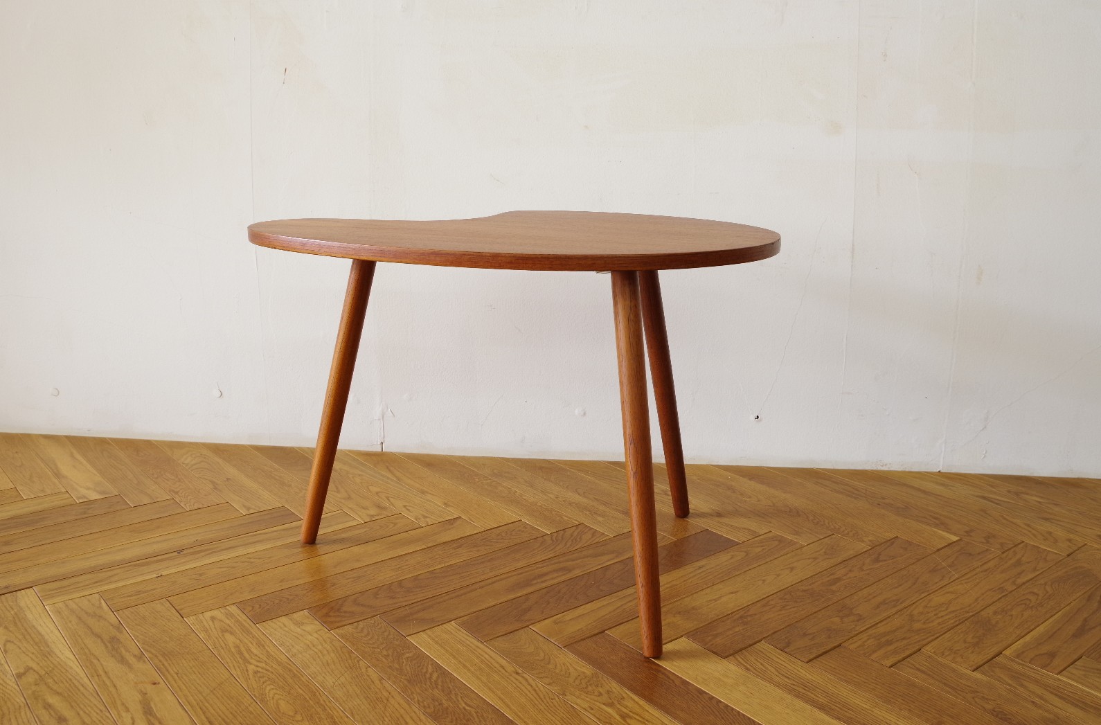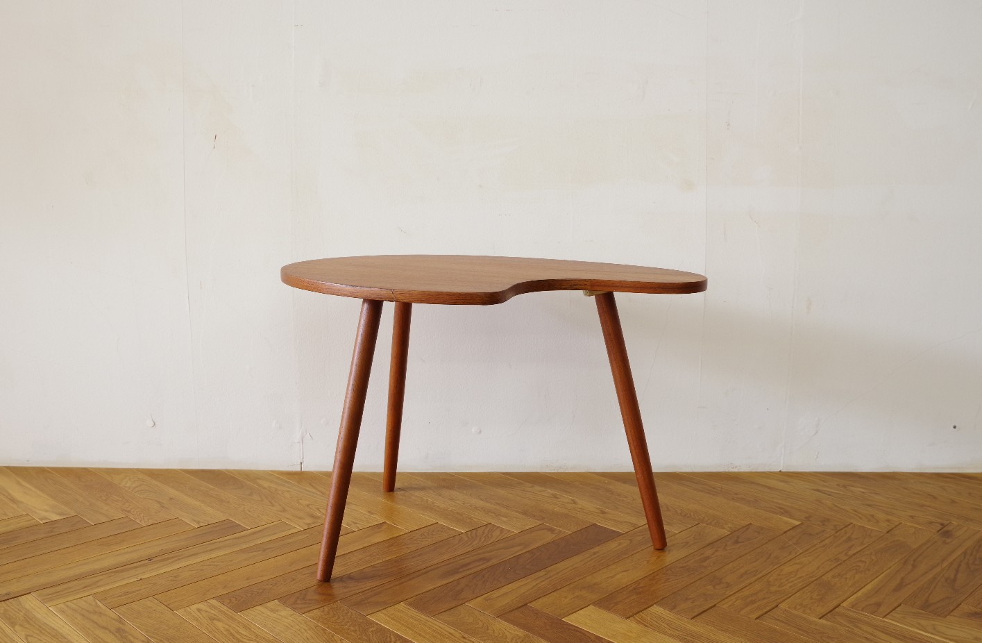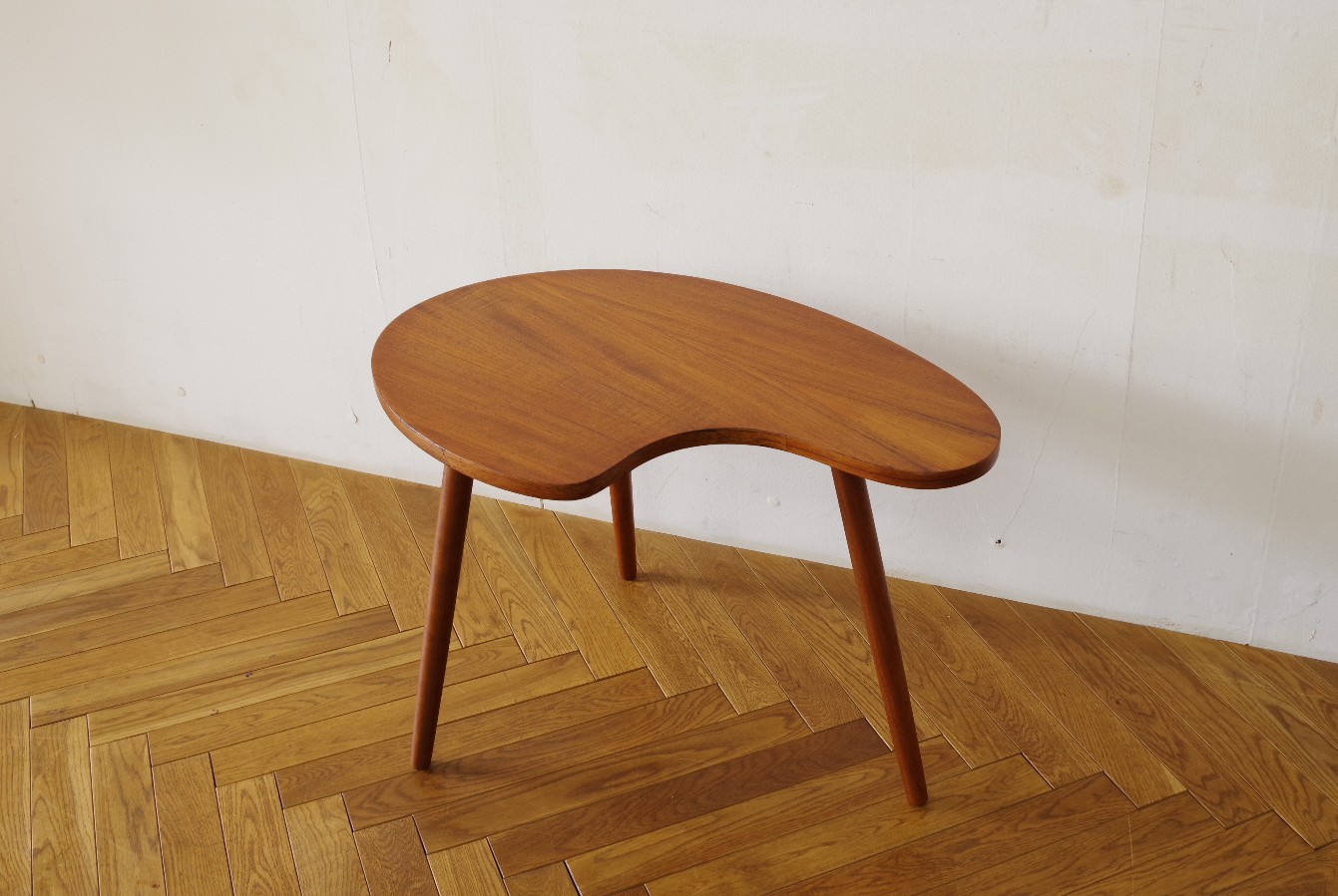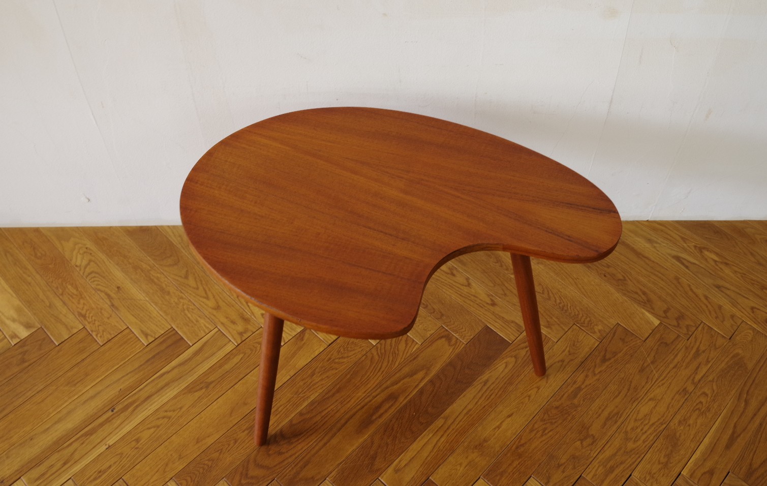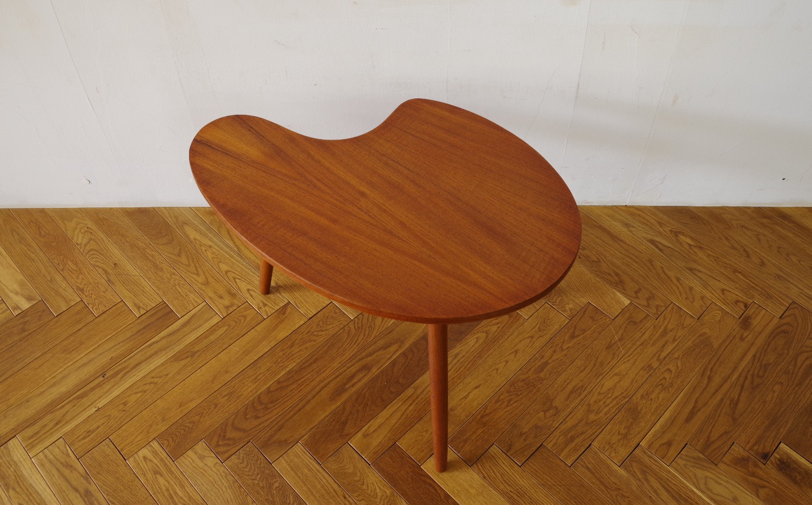 空に浮かぶ雲のような、または湖のような有機的な形の天板が可愛らしく、3本の細身の脚がそれらを強調しています。ソファ前に置いても圧迫感がなく、テーブルでありながら置くだけで絵になる佇まいです。材質は主張しすぎないチーク材が使われておりお部屋に馴染む色味です。補修は元の塗装をはがし全体を段階的に研磨しキズやシミを取り除き、色調を合わせながら水分の浸み込みもなく、また熱に強い塗装で仕上げております。安心してお使いいただけます。