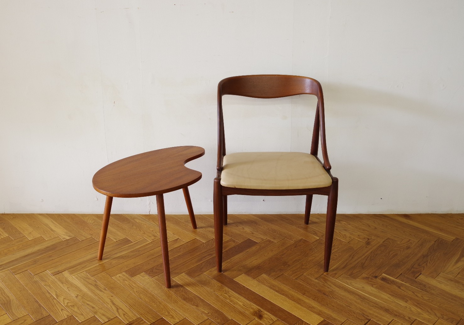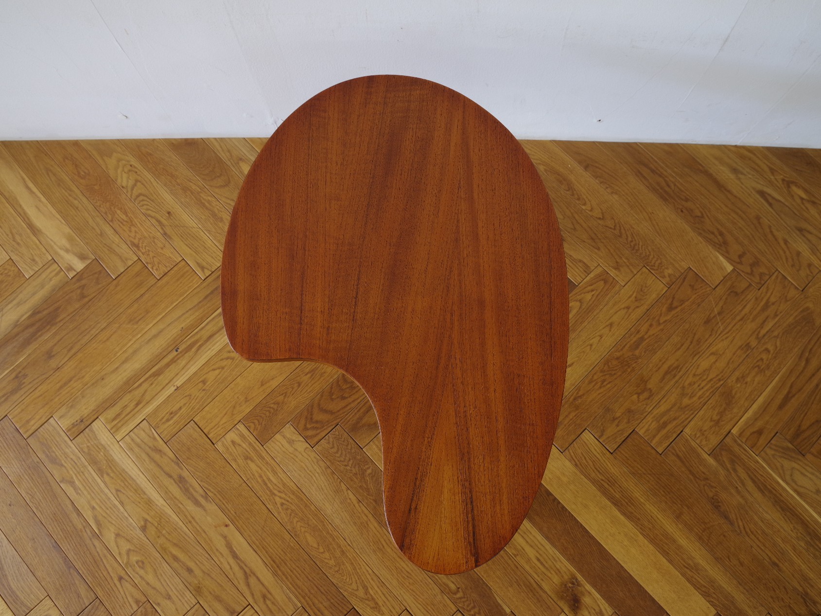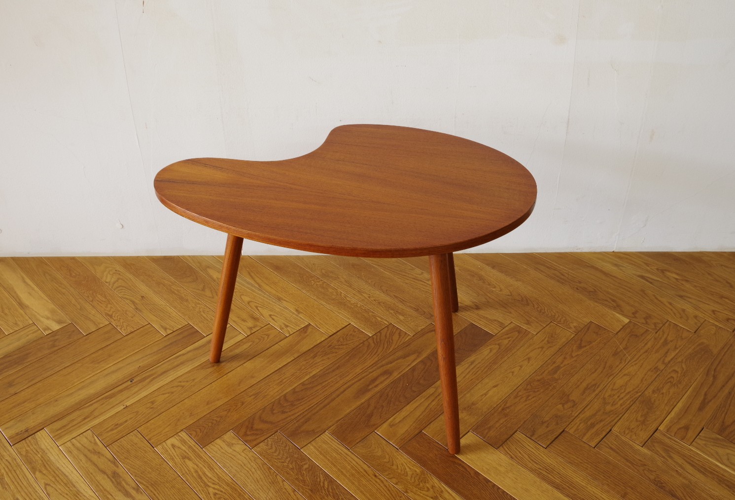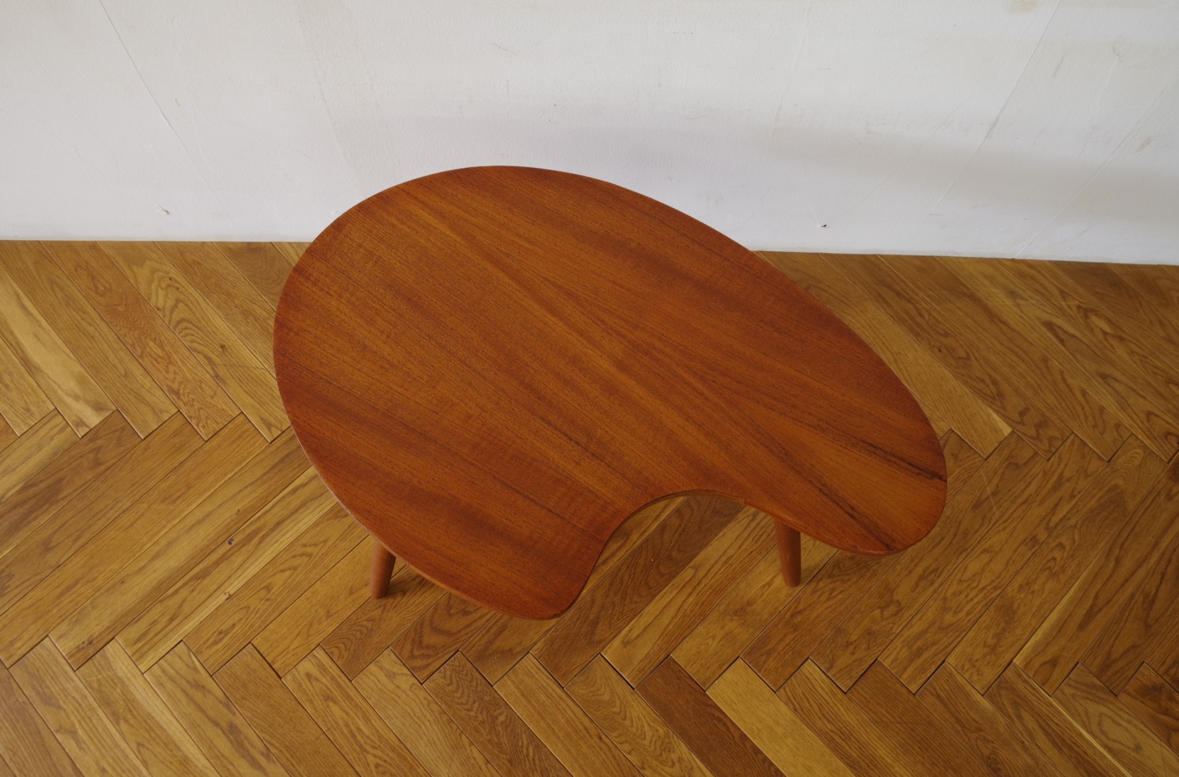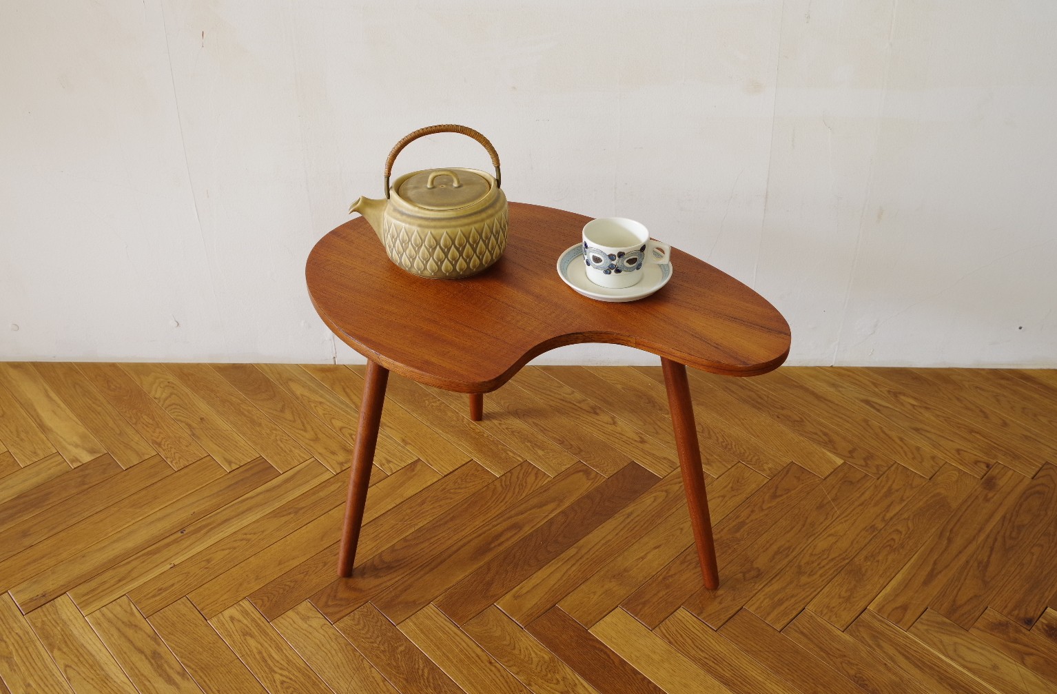 空に浮かぶ雲のような、または湖のような有機的な形の天板が可愛らしく、3本の細身の脚がそれらを強調しています。ソファ前に置いても圧迫感がなく、テーブルでありながら置くだけで絵になる佇まいです。材質は主張しすぎないチーク材が使われておりお部屋に馴染む色味です。補修は元の塗装をはがし全体を段階的に研磨しキズやシミを取り除き、色調を合わせながら水分の浸み込みもなく、また熱に強い塗装で仕上げております。安心してお使いいただけます。