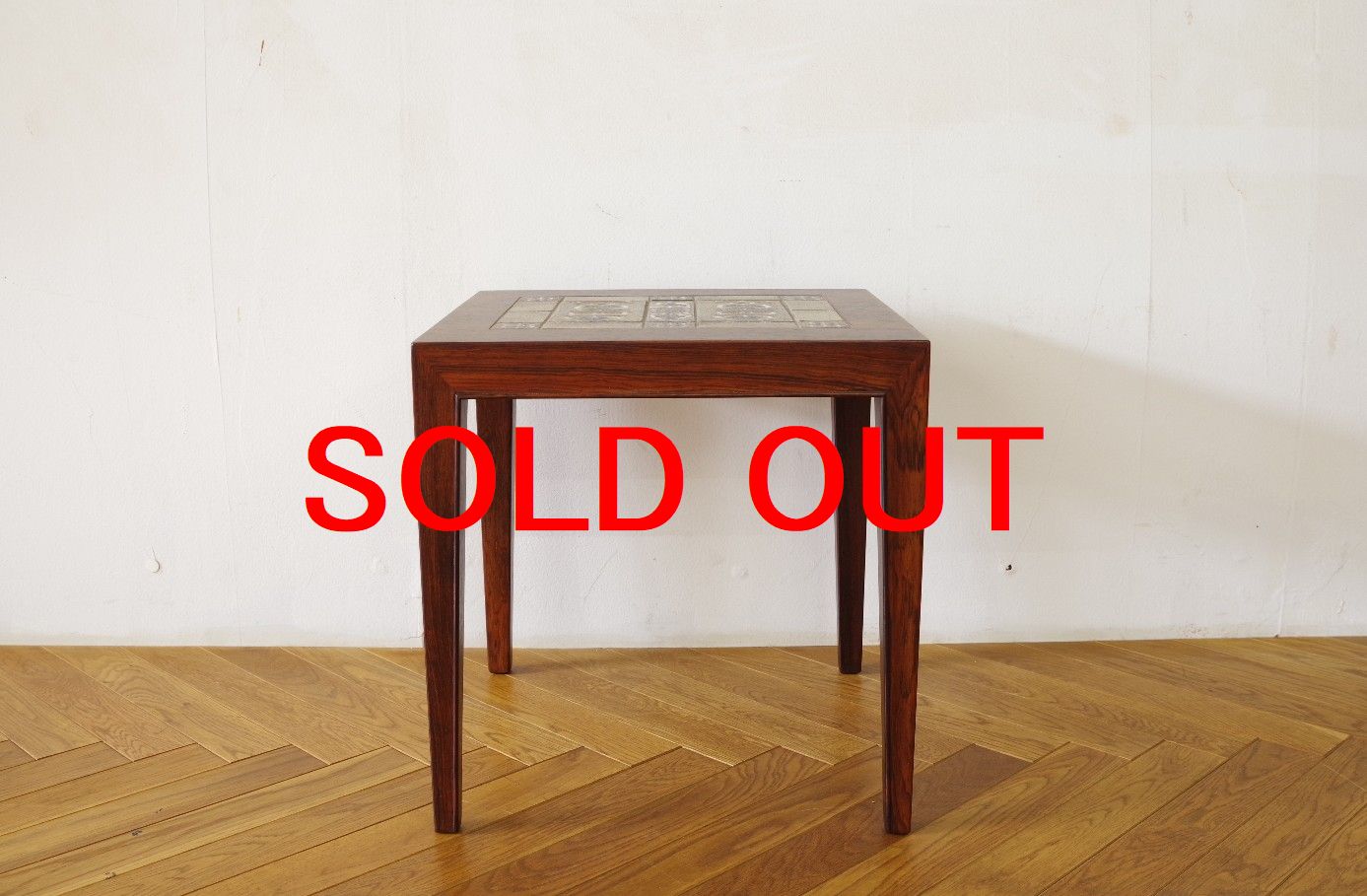 デンマークの家具メーカー、ハスレヴェ社とロイヤルコペンハーゲンとのコラボレーションで生まれたタイルトップテーブル。1960年代に多く製造されていたようです。こちらのサイドテーブルはロイヤルコペンハーゲンのデザイナーだったニルス・トーソンが手掛けたBACAシリーズのタイルが張られています。貝をモチーフにしたような絵柄で、落ち着いたブラウンを基調に青の釉薬が上品さを出しています。ローズウッドのフレームともコントラストが素敵です。小ぶりなサイズ感ですのでソファ近くに置いても場所を取りません。木部補修は元の塗装をはがし全体を段階的に研磨しキズやシミを取り除き、色調を合わせながら水分の浸み込みもなく、また熱に強い塗装で仕上げております。タイルの欠けなどもございません。安心してお使いいただけます。